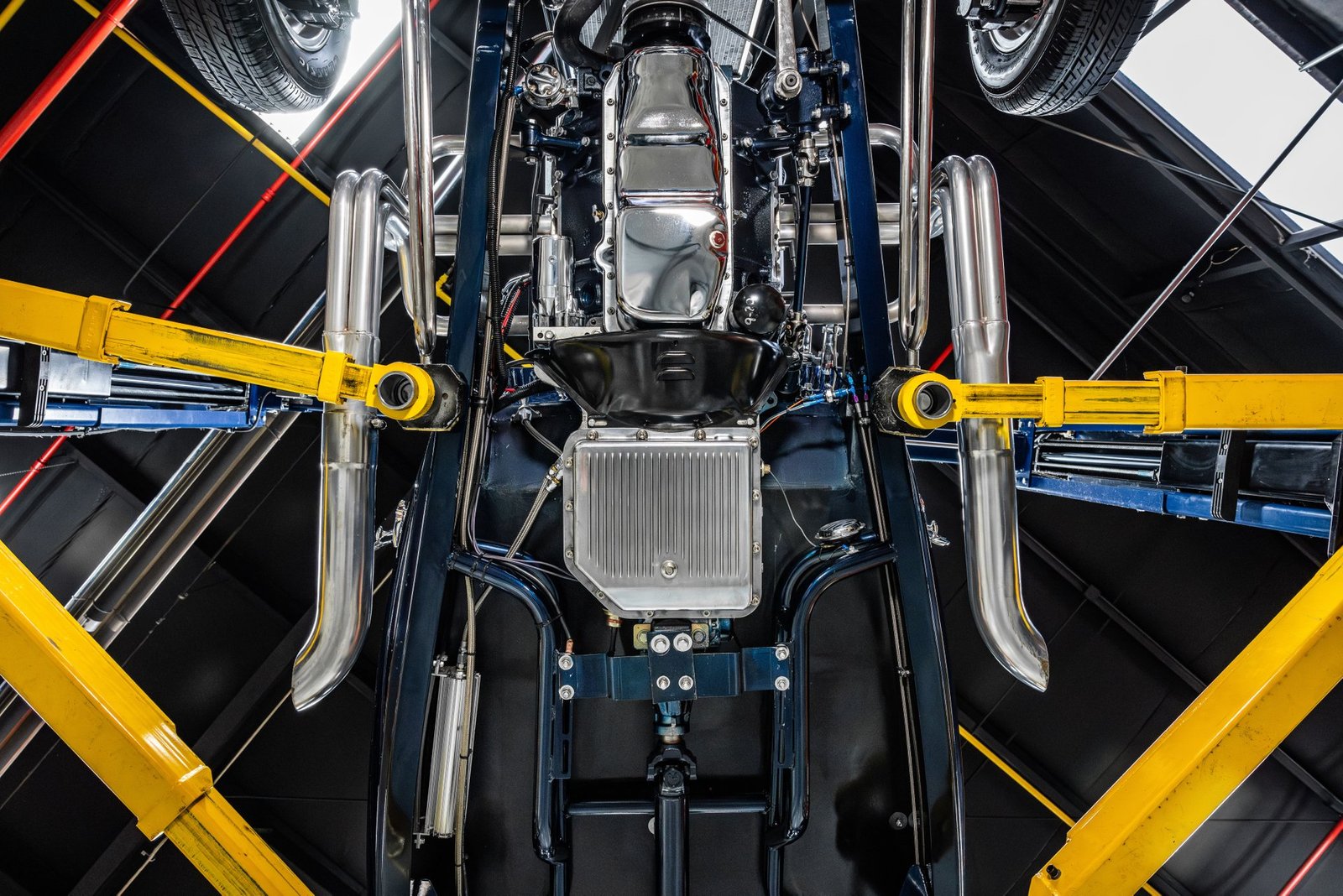 This example is a professionally built street rod completed in 2017, blending classic hot rod design with modern performance and comfort. Finished in a deep dark blue, the fiberglass-bodied coupe presents a clean, aggressive stance with exposed mechanicals that perfectly suit its hot rod personality. The open-engine layout and side-exit exhaust give it a purposeful look that immediately commands attention.