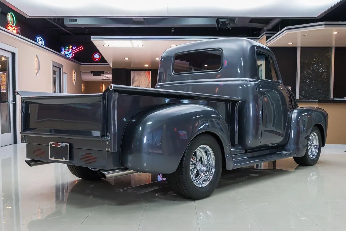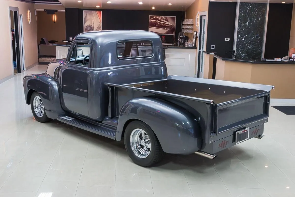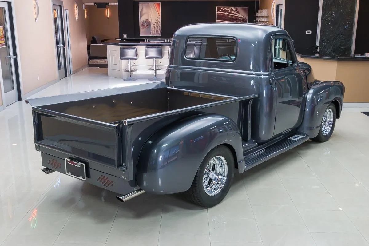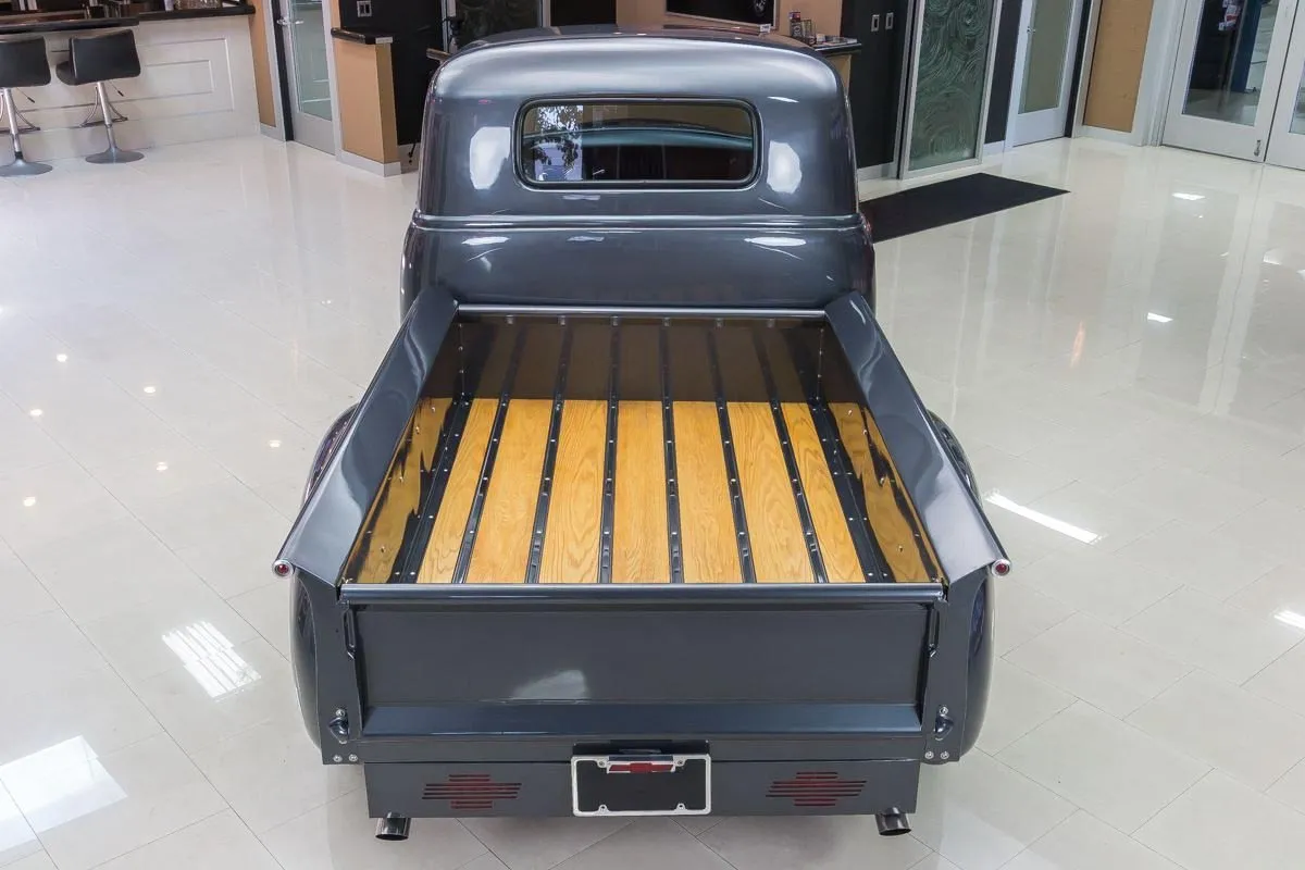 The exterior is finished in a dark charcoal metallic that complements the classic lines of the 3100 while giving it a subtle custom edge. Details such as the wood bed floor, clean body lines, and tasteful trim choices highlight the quality of the restoration without overpowering the truck’s original design. Inside, the cabin offers a clean, functional layout with upgraded seating, modern gauges, and thoughtful touches that balance comfort with classic appeal.