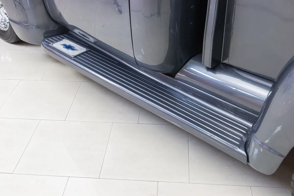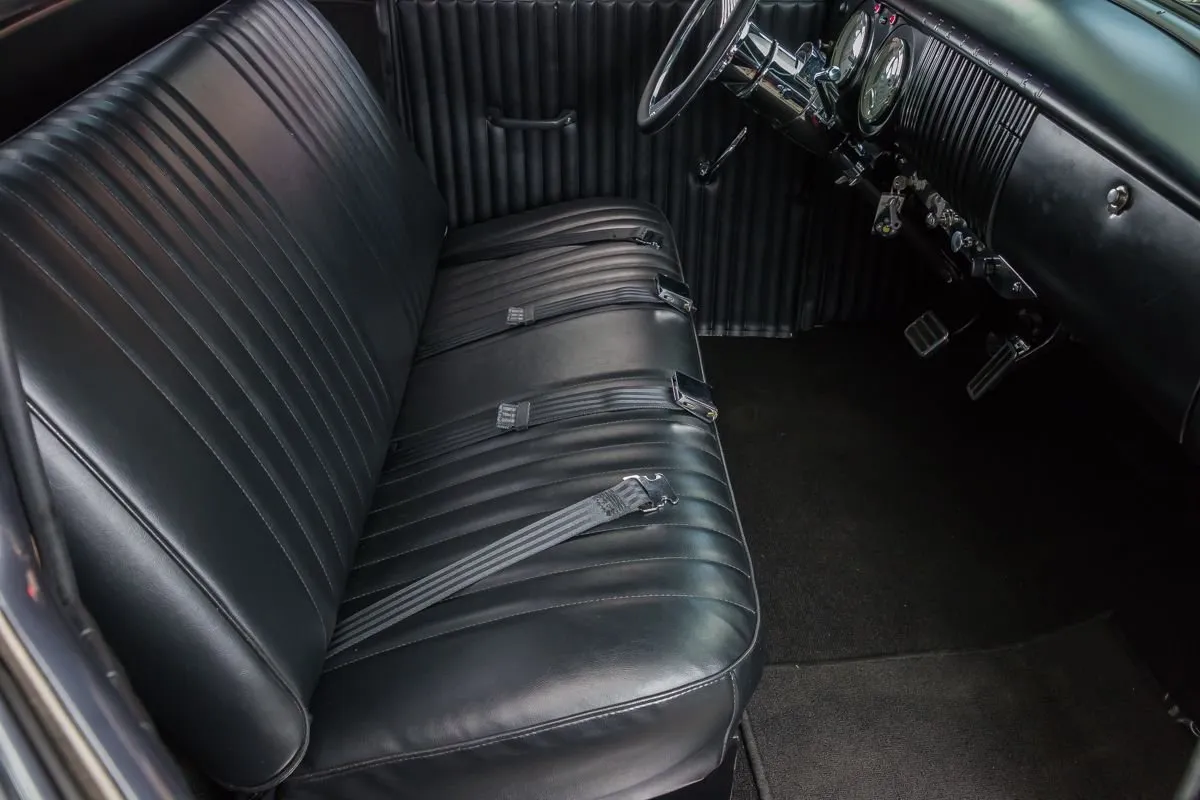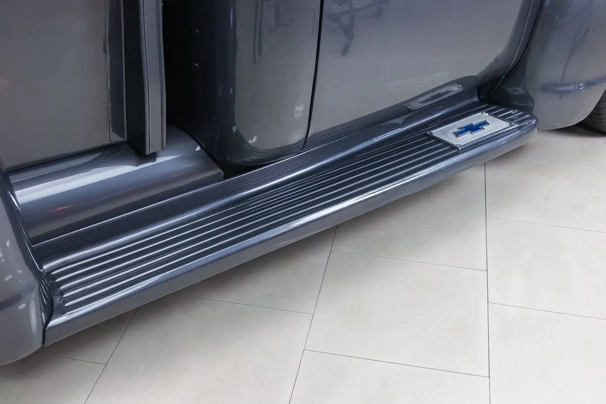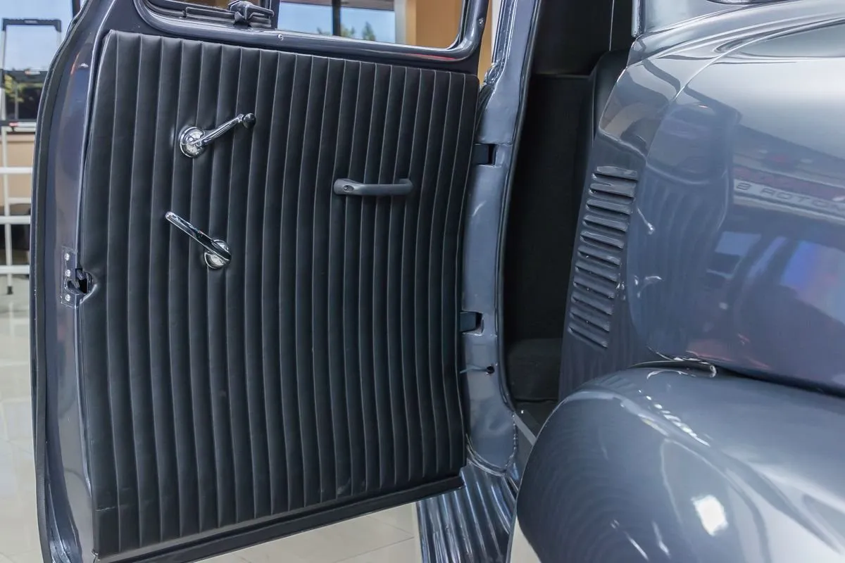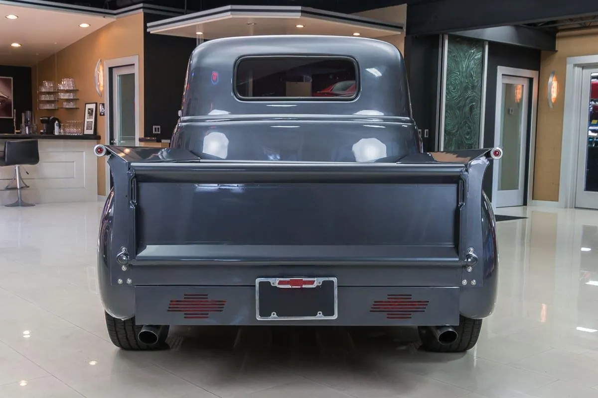 The exterior is finished in a dark charcoal metallic that complements the classic lines of the 3100 while giving it a subtle custom edge. Details such as the wood bed floor, clean body lines, and tasteful trim choices highlight the quality of the restoration without overpowering the truck’s original design. Inside, the cabin offers a clean, functional layout with upgraded seating, modern gauges, and thoughtful touches that balance comfort with classic appeal.