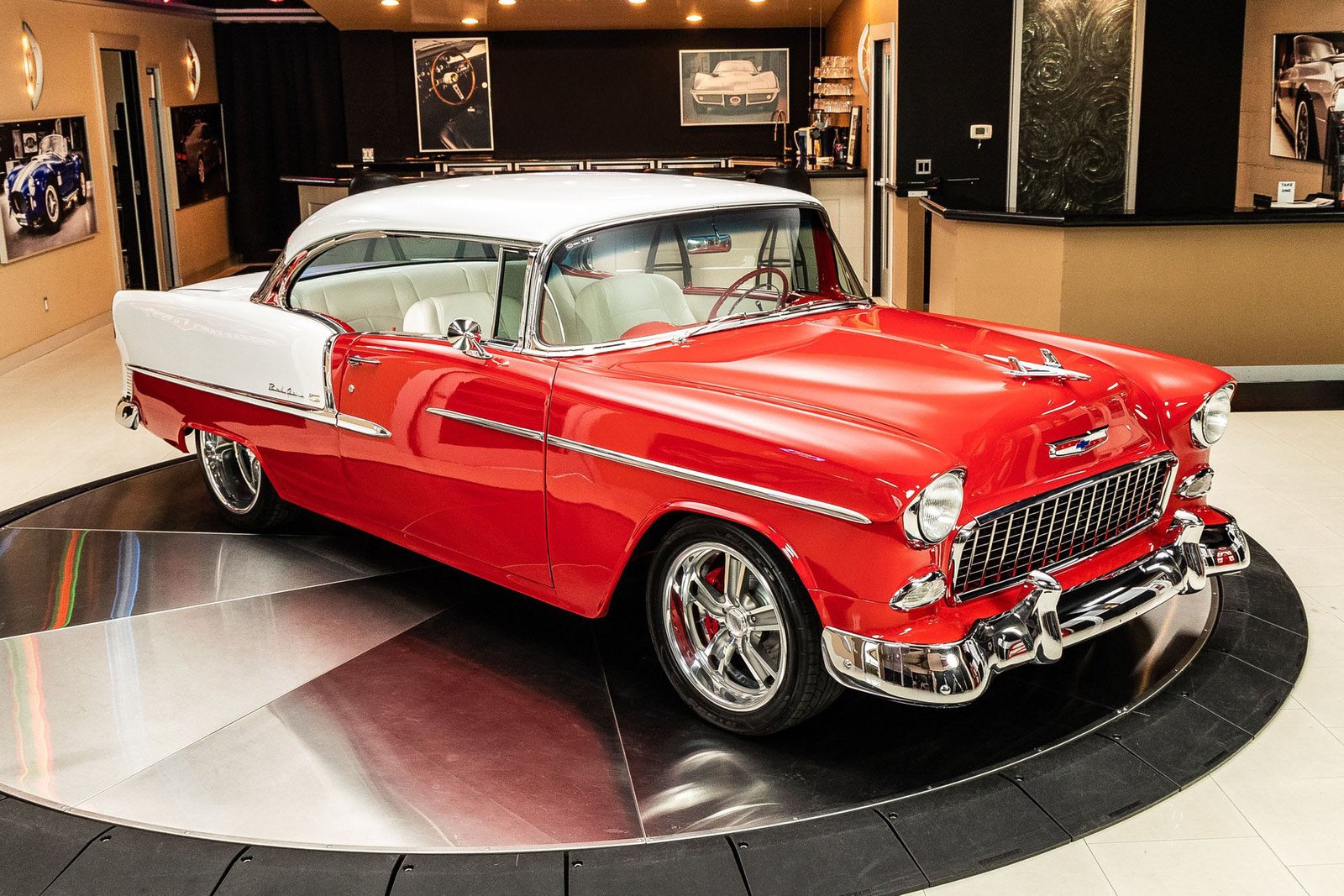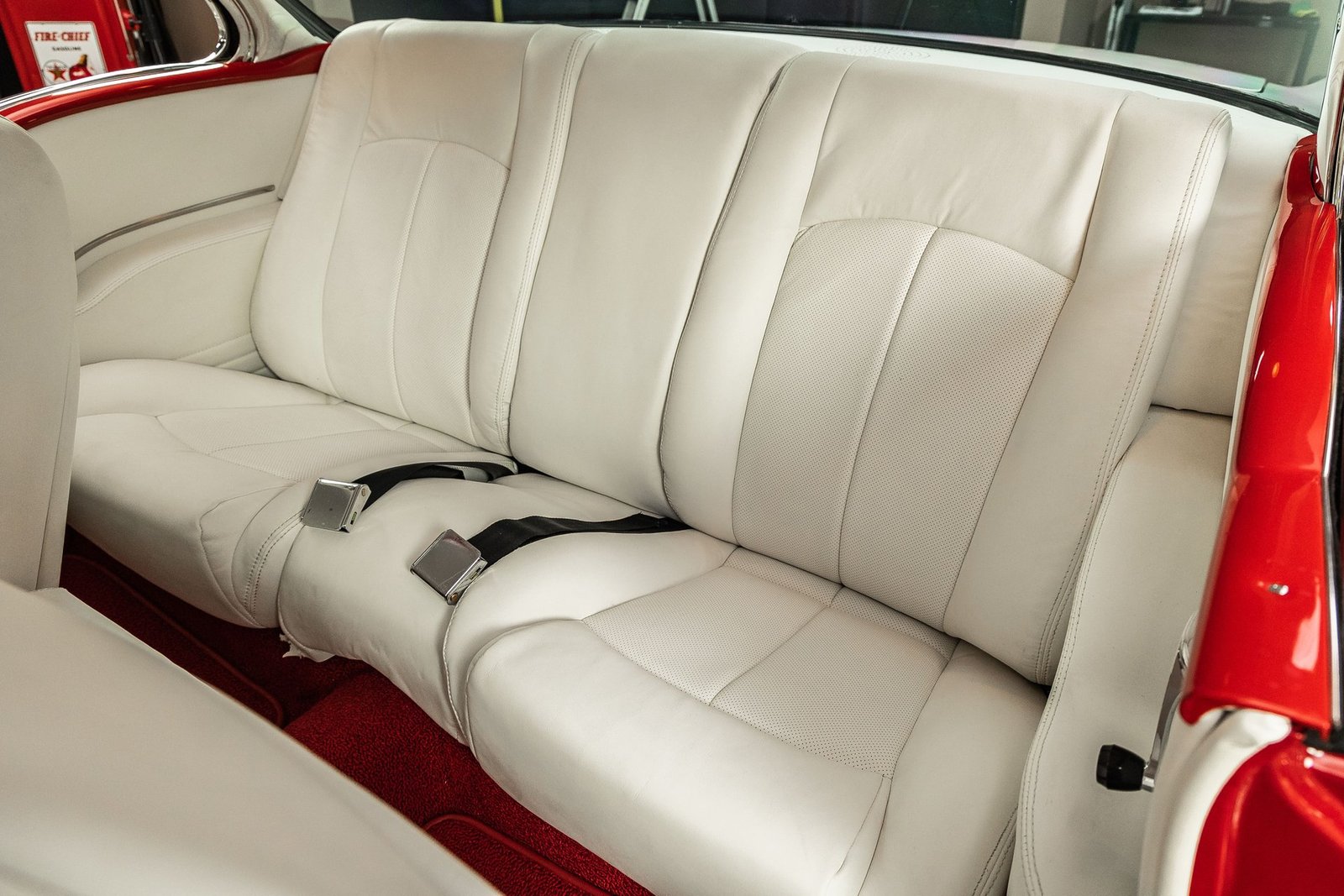 Finished in a striking red and white exterior, the body presents with laser-straight panels and mirror-like paint that highlight the iconic Tri-Five silhouette. Inside, the cabin features custom seating, upgraded interior trim, and thoughtful conveniences that make the car enjoyable for long drives or car show weekends. The fully finished trunk and clean undercarriage further reflect the high level of craftsmanship throughout the build.
