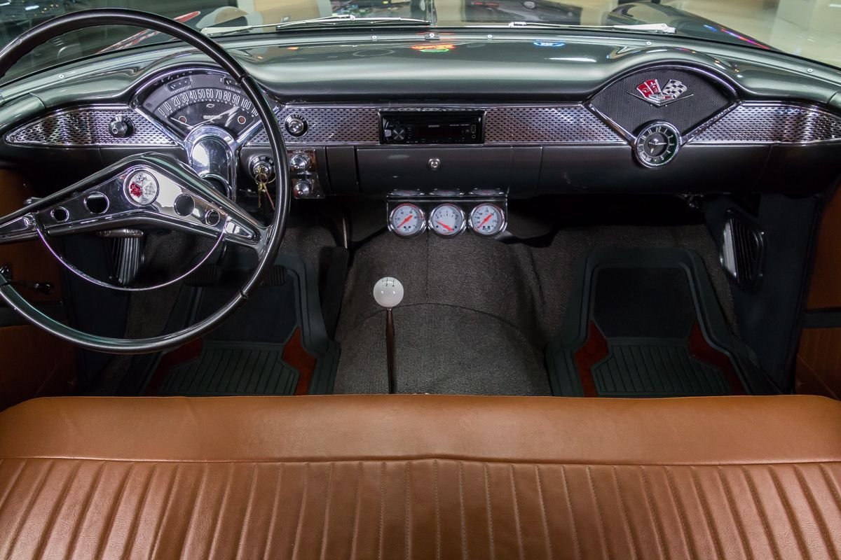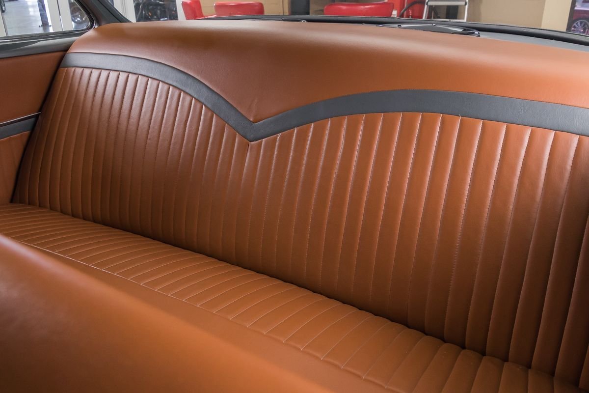 Inside, the cabin offers a tasteful blend of vintage style and restoration-quality refinement. Bench seating upholstered in warm-toned leather complements the exterior color scheme, while the clean dash and traditional layout keep the interior true to its 1950s roots. This Bel Air delivers the look, sound, and feel of a classic American icon, restored to be driven and enjoyed.