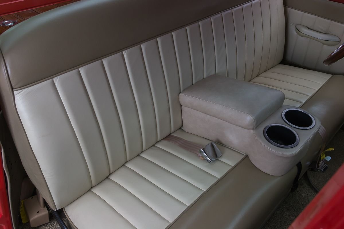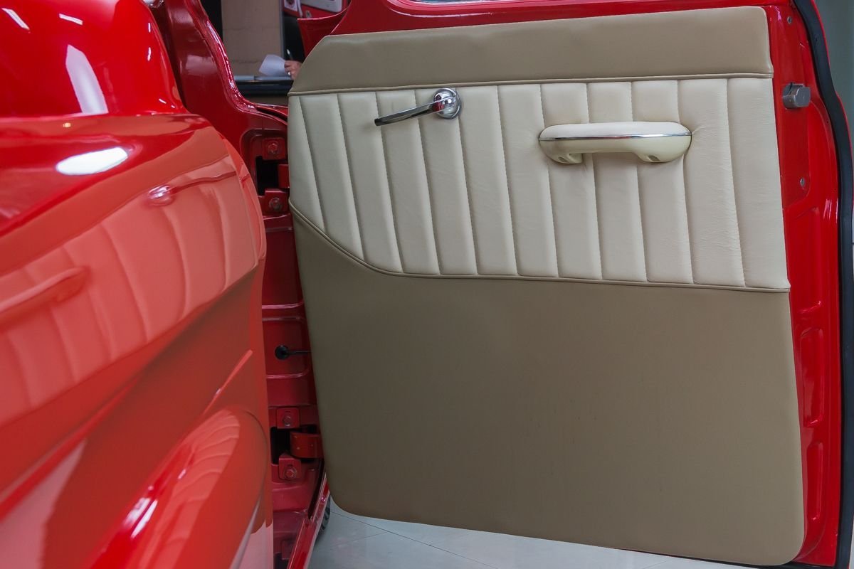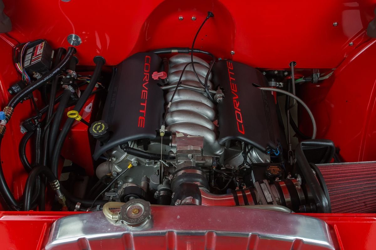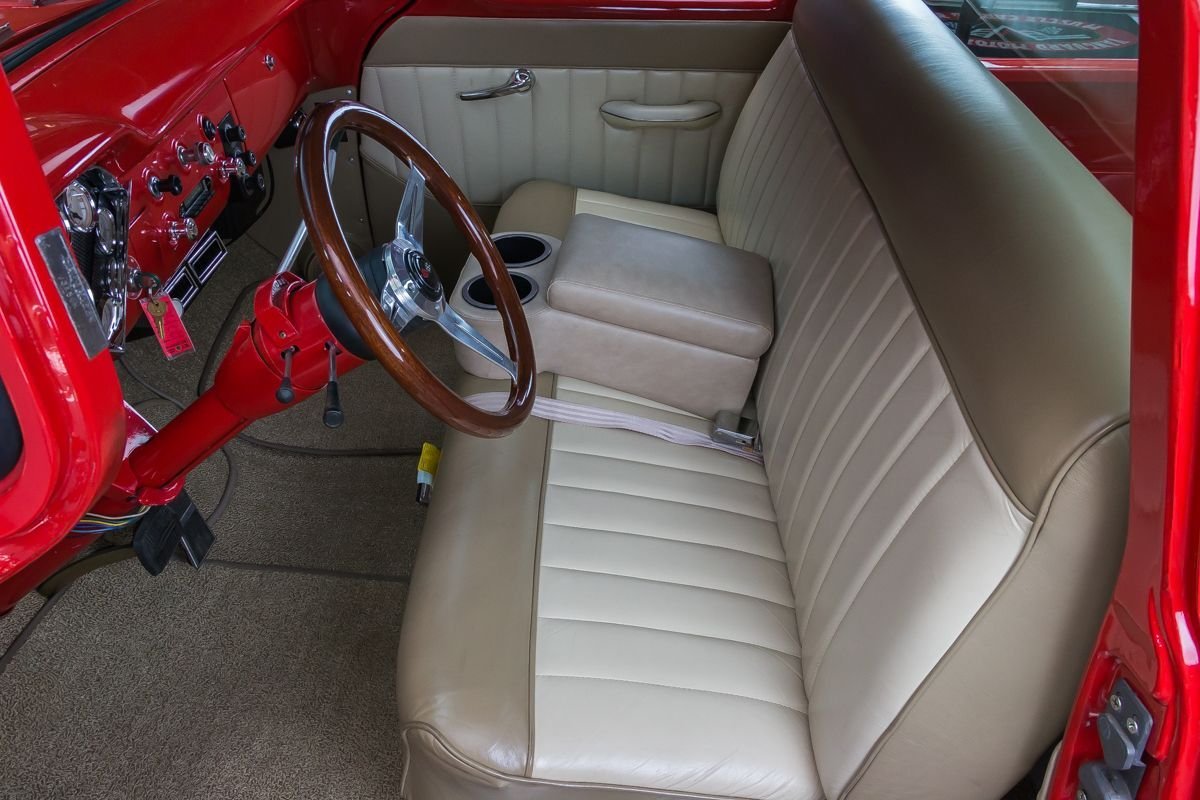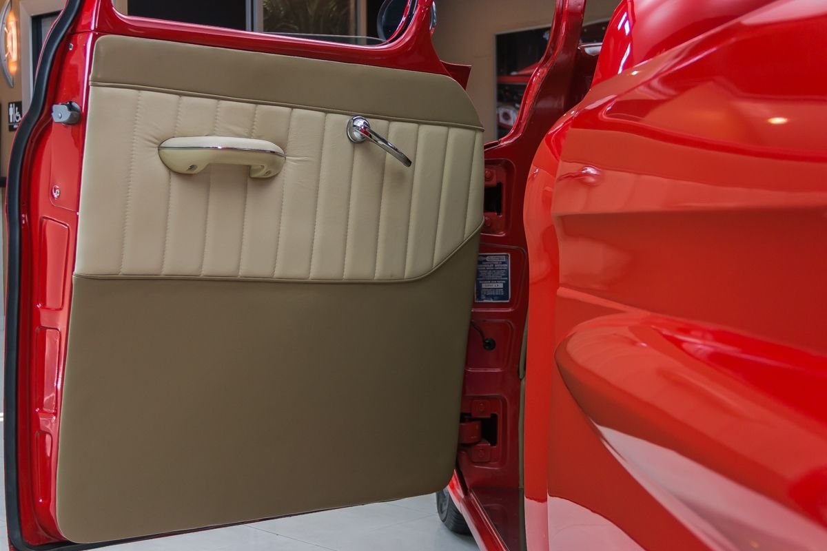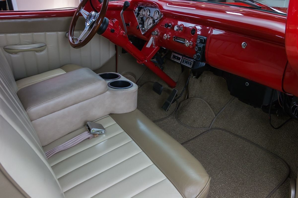Finished in a vibrant red, the exterior highlights the truck’s straight bodywork and classic proportions. Inside, the cabin has been upgraded with a leather-trimmed interior, modern gauges, and power features that add comfort without detracting from the truck’s vintage character. The result is a well-balanced restomod that offers classic pickup charm with modern drivability.
