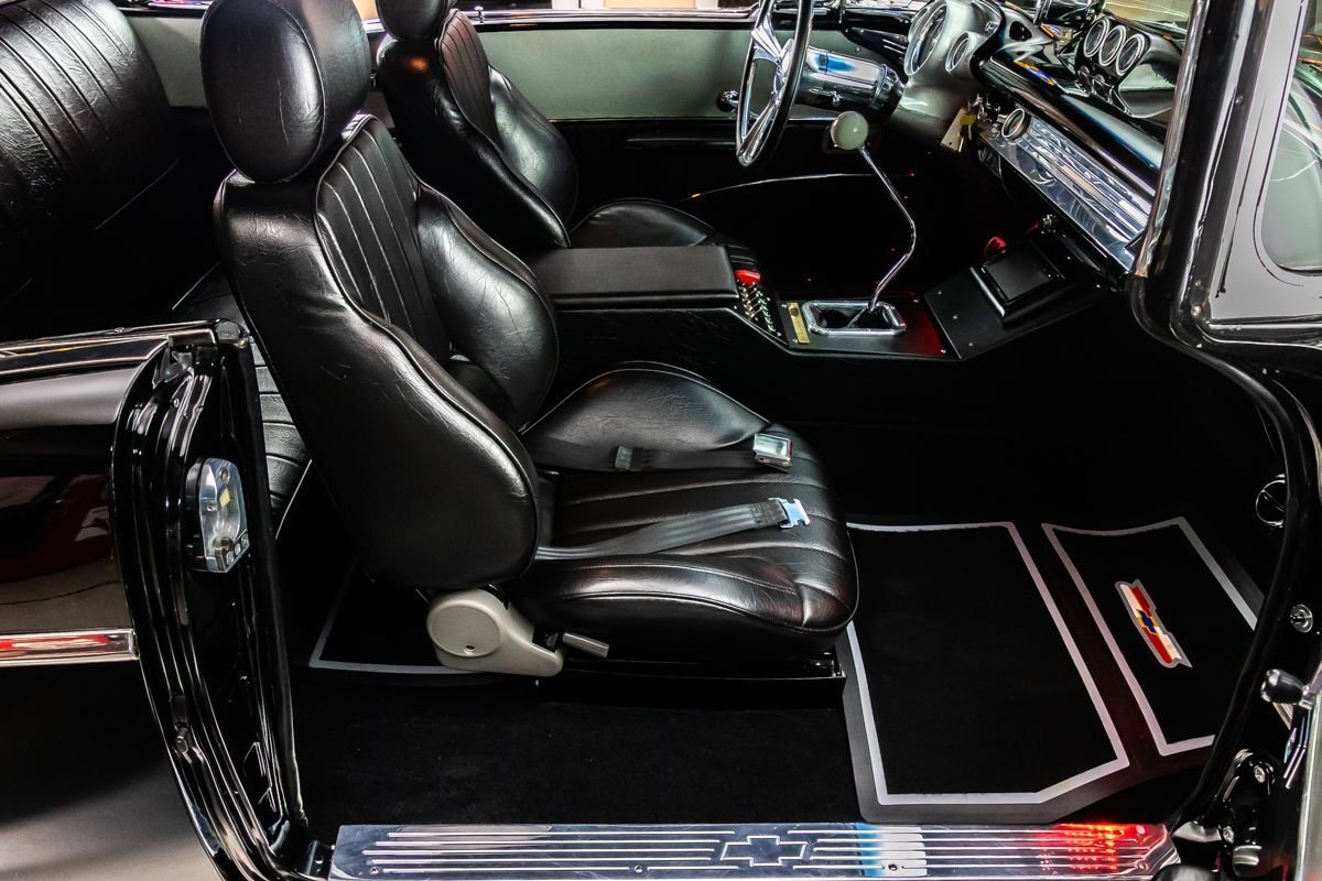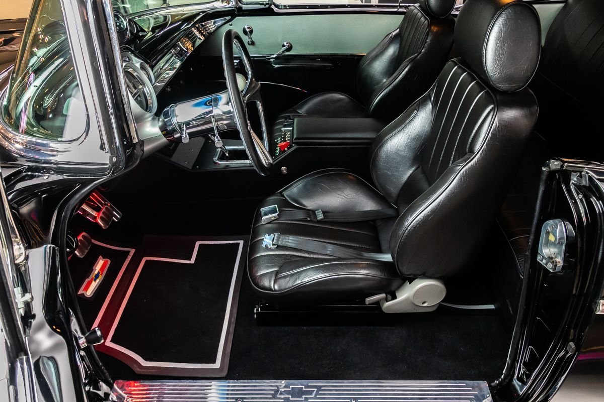 Finished in glossy black, the exterior showcases straight body lines, polished trim, and classic chrome bumpers that highlight the Bel Air’s legendary design. Inside, the custom black interior combines classic proportions with modern touches, including upgraded seating, a center console, and contemporary instrumentation. The result is a striking Tri-Five Chevrolet built to impress at shows while remaining fully capable of being driven and enjoyed.