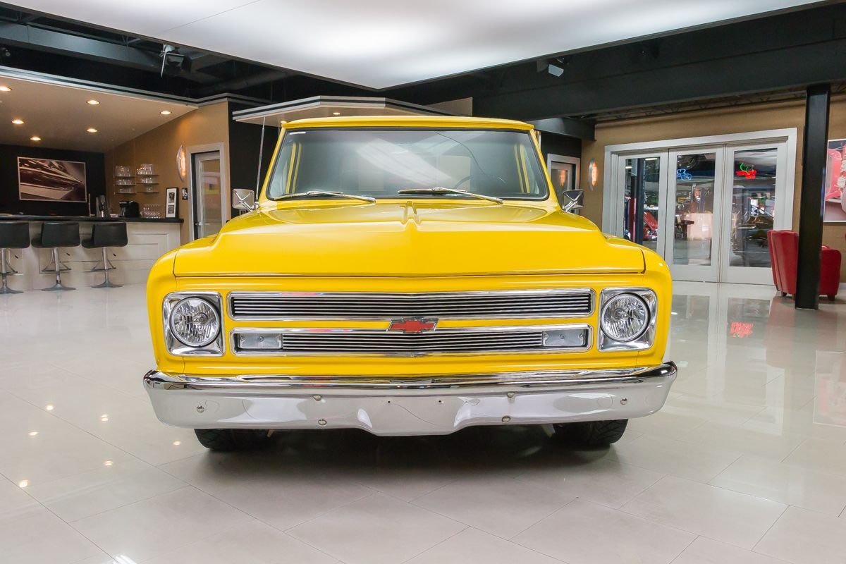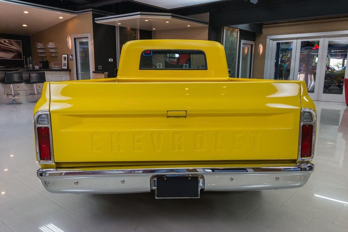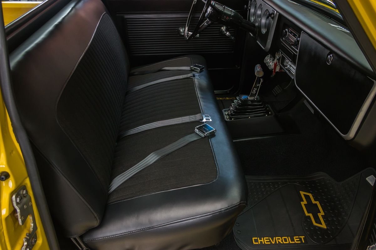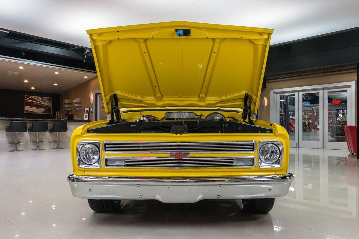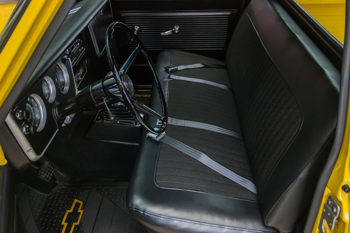 Finished in a bright yellow exterior, the body showcases straight original metal and clean lines that highlight the timeless C10 design. Inside, the black interior offers a simple, functional layout with updated instrumentation and a floor shifter, keeping the focus on driving enjoyment. Overall, this C10 delivers classic pickup style paired with modern big-block performance in a well-executed restoration.