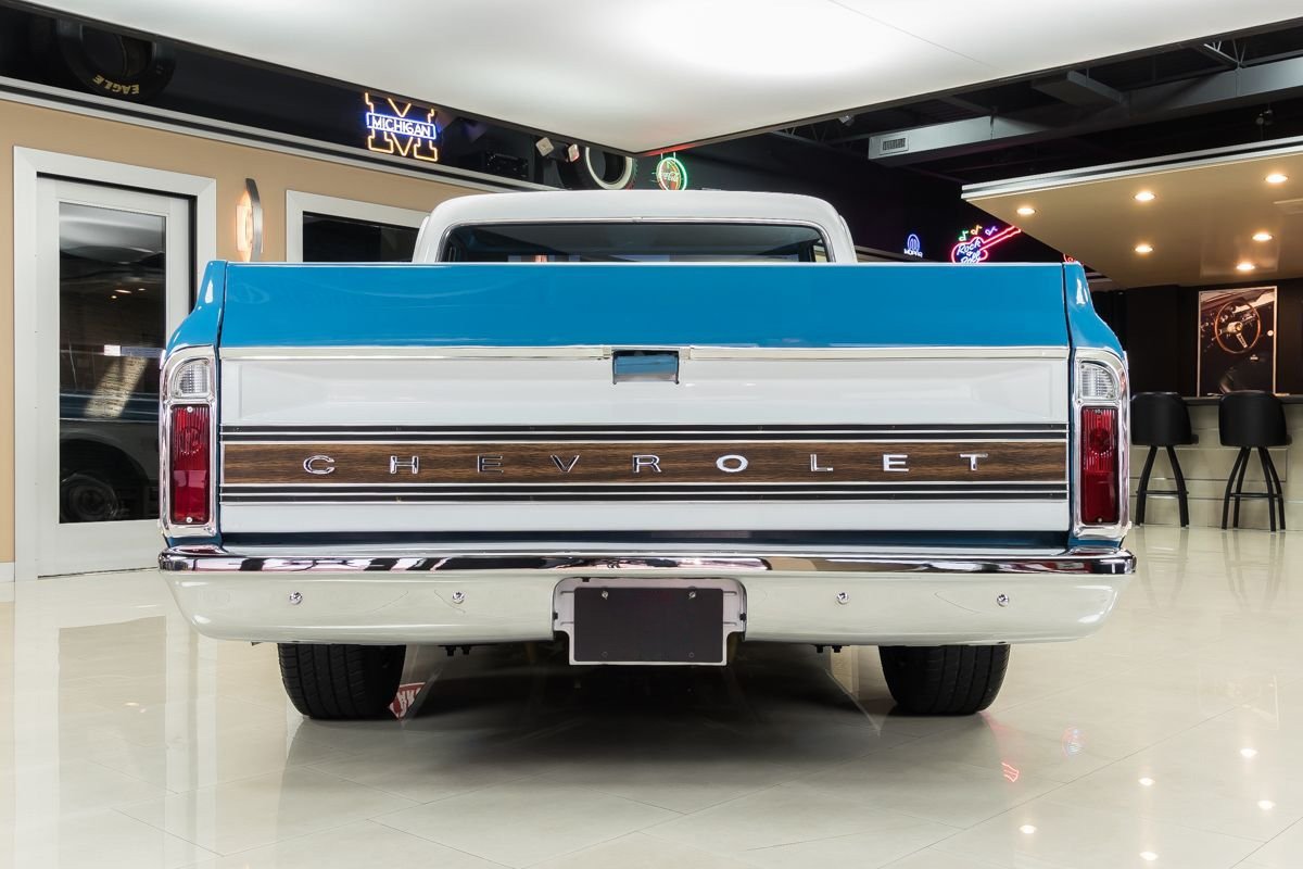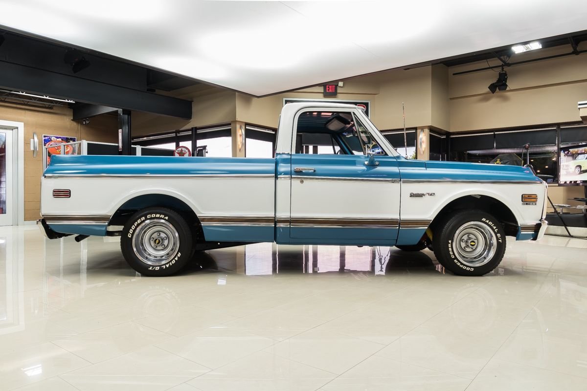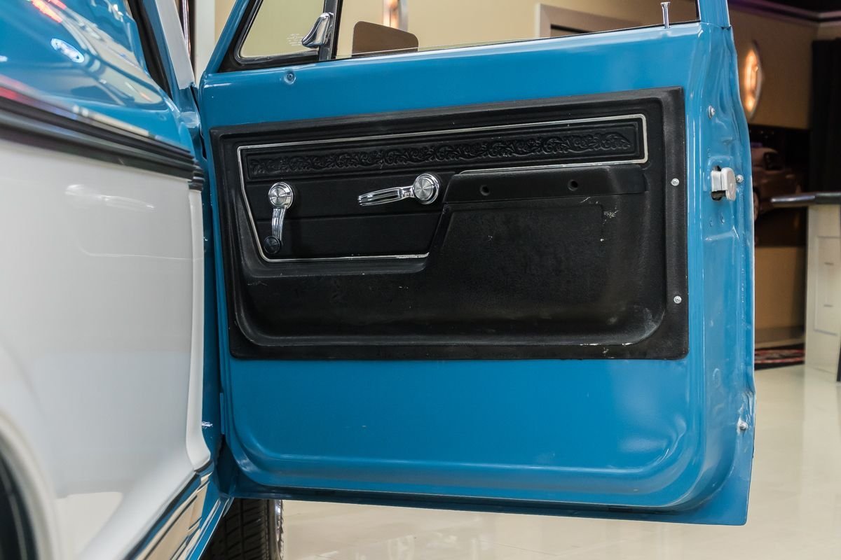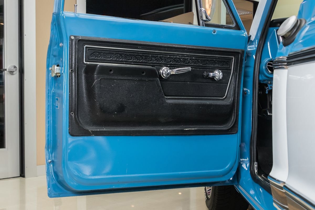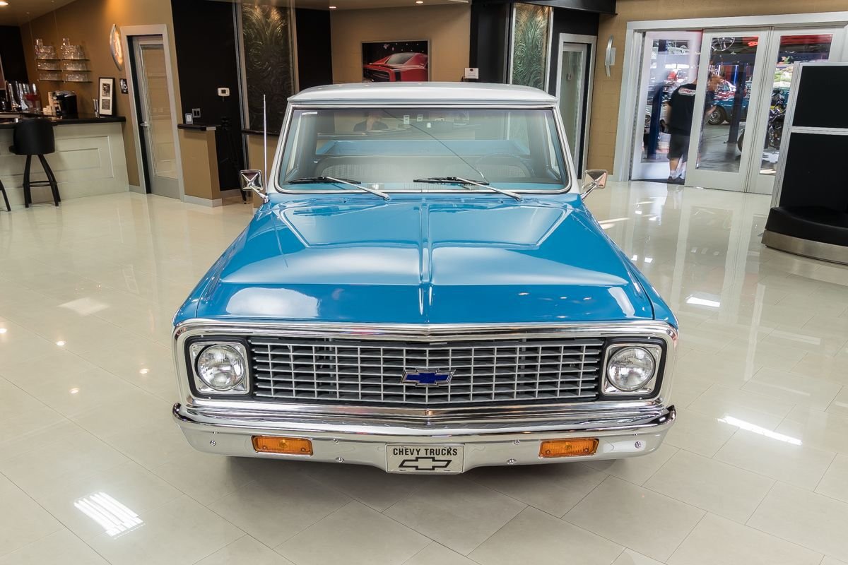 This example has undergone a complete frame-off, rotisserie restoration, executed with a strong focus on quality and factory-correct presentation. Finished in its original-style blue and white two-tone paint scheme, the exterior reflects the timeless appeal of an early-1970s Chevrolet pickup. The body presents cleanly, with straight lines and crisp trim that highlight the truck’s classic proportions.